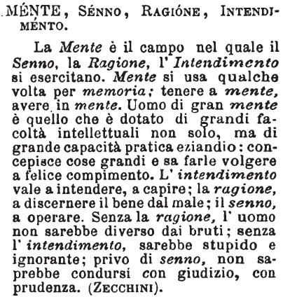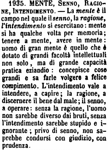 | Mente, Senno, Ragione, Intendimento - La mente è il campo nel quale il senno, la ragione, l'intendimento si esercitano: mente si ha qualche volta per memoria; tenere a mente, avere in mente: uomo di grande mente è quello che è dotato di grandi facoltà intellettuali non solo, ma di grande capacità pratica eziandio: concepisce cose grandi e sa farle volgere a felice compimento. L'intendimento vale a intendere, a capire; la ragione, a discernere il bene dal male; il senno, a operare: senza la ragione, l'uomo non sarebbe diverso dai bruti, senza l'intendimento sarebbe stupido e ignorante; privo di senno, non saprebbe condursi con giudizio, con prudenza. [immagine] |