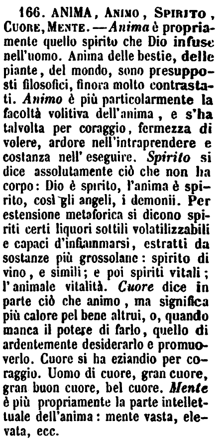 | Anima, Animo, Spirito, Cuore, Mente - Anima è propriamente quello spirito che Dio infuse nell’uomo. Anima delle bestie, delle piante, del mondo, sono presupposti filosofici, finora molto contrastati. Animo è più particolarmente la facoltà volitiva dell’anima, e s’ha talvolta per coraggio, fermezza di volere, ardore nell’intraprendere e costanza nell’eseguire. Spirito si dice assolutamente ciò che non ha corpo: Dio è spirito, l’anima è spirito, così gli angeli, i demonii. Per estensione metaforica si dicono spiriti certi liquori sottili volatilizzabili e capaci d’infiammarsi, estratti da sostanze più grossolane: spirito di vino, e simili; e poi spiriti vitali; l’animale vitalità. Cuore dice in parte ciò che animo, ma significa più calore pel bene altrui, o, quando manca il potere di farlo, quello di ardentemente desiderarlo e promuoverlo. Cuore si ha eziandio per coraggio. Uomo di cuore, gran cuore, gran buon cuore, bel cuore. Mente è più propriamente la parte intellettuale dell’anima: mente vasta, elevata, ecc. [immagine] |