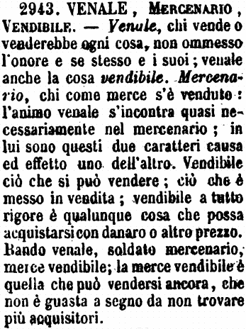 | Venale, Mercenario, Vendibile - Venale, chi vende o venderebbe ogni cosa, non ommesso l'onore e se stesso e i suoi; venale anche la cosa vendibile. Mercenario, chi come merce s'è venduto: l'animo venale s'incontra quasi necessariamente nel mercenario; in lui sono questi due caratteri causa ed effetto uno dell'altro. Vendibile ciò che si può vendere; ciò che è messo in vendita; vendibile a tutto rigore è qualunque cosa che possa acquistarsi con danaro o altro prezzo. Bando venale, soldato mercenario, merce vendibile; la merce vendibile è quella che può vendersi ancora, che non è guasta a segno da non trovare più acquisitori. [immagine] |