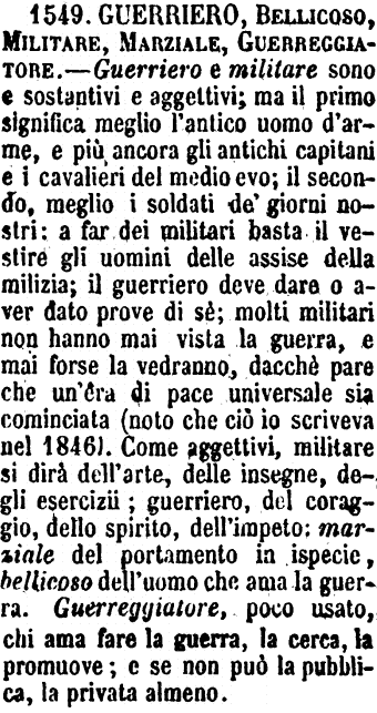 | Guerriero, Bellicoso, Militare, Marziale, Guerreggiatore - Guerriero e militare sono e sostantivi e aggettivi; ma il primo significa meglio l'antico uomo d'arme, e più ancora gli antichi capitani e i cavalieri del medio evo; il secondo, meglio i soldati de' giorni nostri: a far dei militari basta il vestire gli uomini delle assise della milizia; il guerriero deve dare o aver dato prove di sè; molti militari non hanno mai vista la guerra, e mai forse la vedranno, dacchè pare che un'era di pace universale sia cominciata (noto che ciò io scriveva nel 1846). Come aggettivi, militare si dirà dell'arte, delle insegne, degli esercizii; guerriero, del coraggio, dello spirito, dell'impeto: marziale del portamento in ispecie, bellicoso dell'uomo che ama la guerra. Guerreggiatore, poco usato, chi ama fare la guerra, la cerca, la promuove; e se non può la pubblica, la privata almeno. [immagine] |