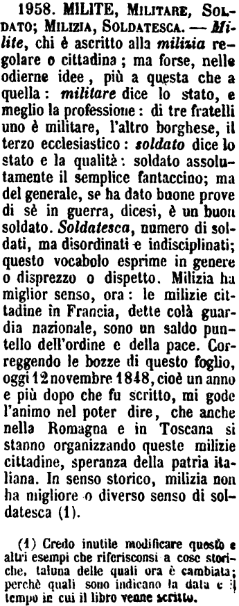 | Milite, Militare, Soldato; Milizia, Soldatesca - Milite, chi è ascritto alla milizia regolare o cittadina; ma forse, nelle odierne idee, più a questa che a quella: militare dice lo stato, e meglio la professione: di tre fratelli uno è militare, l'altro borghese, il terzo ecclesiastico: soldato dice lo stato e la qualità: soldato assolutamente il semplice fantaccino; ma del generale, se ha dato buone prove di sé in guerra, dicesi, è un buon soldato. Soldatesca, numero di soldati, ma disordinati e indisciplinati; questo vocabolo esprime in genere o disprezzo o dispetto. Milizia ha miglior senso, ora: le milizie cittadine in Francia, dette colà guardia nazionale, sono un saldo puntello dell'ordine e della pace. Correggendo le bozze di questo foglio, oggi 12 novembre 1848, cioè un anno e più dopo che fu scritto, mi gode l'animo nel poter dire, che anche nella Romagna e in Toscana si stanno organizzando queste milizie cittadine, speranza della patria italiana. In senso storico, milizia non ha migliore o diverso senso di soldatesca (1).