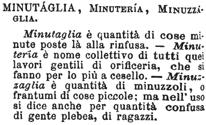 | Minutaglia, Minuteria, Minuzzaglia - Minutaglia è quantità di cose minute poste là alla rinfusa. - Minuteria è nome collettivo di tutti quei lavori gentili di oreficeria, che si fanno per lo più a cesello. - Minuzzaglia è quantità di minuzzoli, o frantumi di cose piccole; ma nell'uso si dice anche per quantità confusa di gente plebea, di ragazzi. [immagine] |