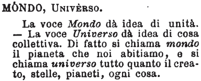 | Mondo, Universo - La voce Mondo dà idea di unità. - La voce Universo dà idea di cosa collettiva. Di fatto si chiama mondo il pianeta che noi abitiamo, e si chiama universo tutto quanto il creato, stelle, pianeti, ogni cosa. [immagine] |