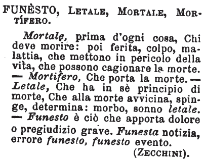 | Funesto, Letale, Mortale, Mortifero - Mortale, prima d'ogni cosa, chi deve morire: poi ferita, colpo, malattia che mettono in pericolo della vita, che possono cagionare la morte. Mortifero, che porta la morte. Letale, che ha in sè principio di morte, che alla morte avvicina, spinge, determina: morbo, sonno letale. Funesto è ciò che apporta dolore o pregiudizio grave. Funesta notizia, errore funesto, funesto evento. [immagine] |