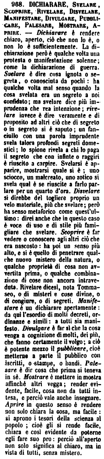 Dichiarare, Svelare, Scoprire, Rivelare, Disvelare, Manifestare, Divulgare, Pubblicare, Palesare, Mostrare, Aprire - Dichiarare è rendere chiaro, aperto, ciò che non lo è, o non lo è sufficientemente. La dichiarazione però è qualche volta una protesta o manifestazione solenne; come la dichiarazione di guerra. Svelare è dire cosa ignota o segreta, o conosciuta da pochi: ha qualche volta mal senso quando la cosa svelata era un segreto a noi confidato; ma svelare dice più imprudenza che rea intenzione; rivelare invece è dire veramente e di proposito ad altri ciò che di segreto o in segreto si è saputo; un fanciullo con una parola imprudente svela talora profondi segreti domestici; lo spione rivela a chi lo paga il segreto che con infinte o raggiri è riuscito a carpire. Svelarsi è apparire, mostrarsi quale si è; uno sciocco, un malcreato, uno zotico si svela qual è se riuscite a farlo parlare per un quarto d'ora. Disvelare si direbbe del togliere proprio un velo materiale, più che svelare; però ha senso metaforico come quest'ultimo: direi anche che in questo caso è voce di uso e di stile più famigliare che svelare. Scoprire è far vedere o conoscere agli altri ciò che era nascosto: ha poi un senso più alto, e si è quello di penetrare qualche nuovo mistero della natura, o qualche proprietà di cosa non avvertita prima, o qualche combinazione di cose non ancora intraveduta. Rivelare dicesi, nota Tommaseo, o di misteri e cose divine, o di congiure, o di segreti.