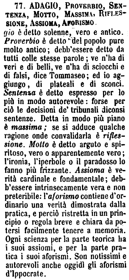 | Adagio, Proverbio, Sentenza, Motto, Massima, Riflessione, Assioma, Aforismo - Adagio è detto solenne, vero e antico. Proverbio è detto del popolo pure molto antico; debb'essere detto da tutti colle stesse parole; ve n'ha di veri e di belli, ve n'ha di sciocchi e di falsi, dice Tommaseo; ed io aggiungo, di plateali e di sconci. Sentenza è detto espresso per lo più in modo autorevole: forse per ciò le decisioni de' tribunali diconsi sentenze. Detta in modo più piano è massima; se si adduce qualche ragione onde convalidarla è riflessione. Motto è detto arguto e spiritoso, vero o apparentemente vero; l'ironia, l'iperbole o il paradosso lo fanno più frizzante. Assioma è verità cardinale e fondamentale; debb'èssere intrinsecamente vera e non preteribile: l'aforismo contiene d'ordinario una verità dimostrata dalla pratica, e perciò ristretta in un principio o regola breve e chiara da potersi facilmente tenere a memoria. Ogni scienza per la parte teorica ha i suoi assiomi, e per la parte pratica i suoi aforismi. Son notissimi e autorevoli anche oggidì gli aforismi d'Ippocrate. [immagine] |