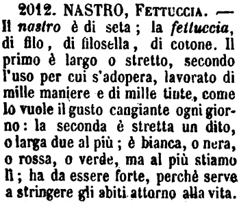 | Nastro, Fettuccia - Il nastro è di seta; la fettuccia, di filo, di filosella, di cotone. Il primo è largo o stretto, secondo l'uso per cui s'adopera, lavorato di mille maniere e di mille tinte, come lo vuole il gusto cangiante ogni giorno: la seconda è stretta un dito, o larga due al più; è bianca, o nera, o rossa, o verde, ma al più stiamo lì; ha da essere forte, perchè serve a stringere gli abiti attorno alla vita. [immagine] |