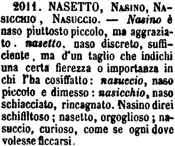 | Nasetto, Nasino, Nasicchio, Nasuccio - Nasino è naso piuttosto piccolo, ma aggraziato. nasetto, naso discreto, sufficiente, ma d'un taglio che indichi una certa fierezza o importanza in chi l'ha cosiffatto: nasuccio, naso piccolo e dimesso: nasicchio, naso schiacciato, rincagnato. Nasino direi schifiltoso; nasetto, orgoglioso; nasuccio, curioso, come se ogni dove volesse ficcarsi. [immagine] |