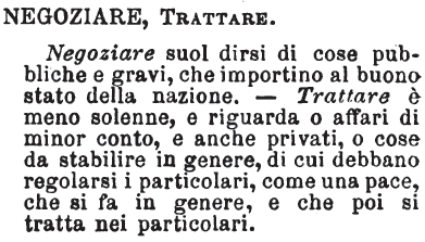 | Negoziare, Trattare - Negoziare suol dirsi di cose pubbliche e gravi, che importino al buono stato della nazione. - Trattare è meno solenne, e riguarda o affari di minor conto, e anche privati, o cose da stabilire in genere, di cui debbano regolarsi i particolari, come una pace, che si fa in genere, e che poi si tratta nei particolari. [immagine] |