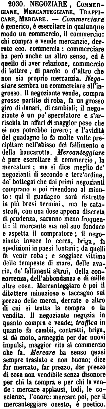 | Negoziare, Commerciare, Mercanteggiare, Trafficare, Mercare - Commerciare è generico, è esercitare in qualunque modo un commercio, il commercio: chi compra e vende mercanzie, derrate ecc. commercia: commerciare ha però anche un altro senso, ed è quello di aver relazione, commercio di lettere, di parole o d'altro che non sia proprio mercanzia. Negoziare sembra un commerciare all'ingrosso. Il negoziante vende, compra grosse partite di roba, fa un grosso giro di danari, di cambiali; il negoziante è un po' speculatore e s'arrischia in affari di maggior peso che ei non potrebbe invero; e l'avidità del guadagno lo fa molte volte precipitare nell'abisso del fallimento e della bancarotta. Mercanteggiare è pure esercitare il commercio, la mercatura; ma si dice meglio de' negozianti di secondo e terz'ordine, de' bottegai che dai primi negozianti comprano e poi rivendono al minuto: qui il guadagno sarà ristretto in più brevi termini, ma le catastrofi, con una dose appena discreta di prudenza, saranno meno frequenti: il mercante sta nel suo fondaco e aspetta il compratore; il negoziante invece lo cerca, briga, fa spedizioni in paesi lontani; da quelli fa venir roba; e soggiace vittima delle tempeste di mare, delle avarie, de' fallimenti altrui, della concorrenza, dell'abbondanza e di mille altre cose. Mercanteggiare è poi il dibattere minuzioso e taccagno sul prezzo delle merci, derrate o altro di cui si tratta la compra o la vendita. Il negoziante negozia in quanto compra e vende; traffica in quanto fa cambii, contratti, briga, si dà moto, armeggia per dar nuovi impulsi, maggior vita al commercio che fa. Mercare ha senso quasi sempre traslato e non buono; dice far mercato, far prezzo, dar prezzo di cosa non vendibile senza disonore per chi la compra e per chi la vende: mercare applausi, lodi, le coscienze, l'onore: mercare poi, per il mercanteggiare onesto, è poetico. [immagine] |