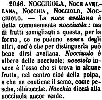 | Nocciuola, Noce avellana, Nocchia, Nocciolo, Nocciuolo - La noce avellana è detta comunemente nocciuola: ma di frutti somiglianti a questa, per la forma, ce ne puonno essere degli altri, ond'è che per distinguerla può bene dirsi avellana. Nocciuolo è albero delle nocciuole; nocciolo invece è l'osso che si trova in alcune frutta, nel centro cioè della polpa, e che ne contiene il seme, come pesche, albicocche. Nocchia dicesi alla nocciuola ancor verde. [immagine] |