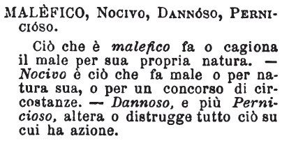 | Malefico, Nocivo, Dannoso, Pernicioso - Ciò che è malefico fa o cagiona il male per sua propria natura. - Nocivo è ciò che fa male o per natura sua, o per un concorso di circostanze. - Dannoso, e più Pernicioso, altera o distrugge tutto ciò su cui ha azione. [immagine] |