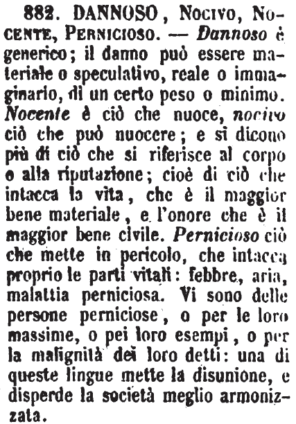 | Dannoso, Nocivo, Nocente, Pernicioso - Dannoso è generico; il danno può essere materiale o speculativo, reale o immaginario, di un certo peso o minimo. Nocente è ciò che nuoce, nocivo ciò che può nuocere; e si dicono più di ciò che si riferisce al corpo e alla riputazione; cioè di ciò che intacca la vita, che è il maggior bene materiale, e l'onore che è il maggior bene civile. Pernicioso ciò che mette in pericolo, che intacca proprio le parti vitali: febbre, aria, malattia perniciosa. Vi sono delle persone perniciose, o per le loro massime, o pei loro esempi, o per la malignità dei loro detti: una di queste lingue mette la disunione, e disperde la società meglio armonizzata. [immagine] |