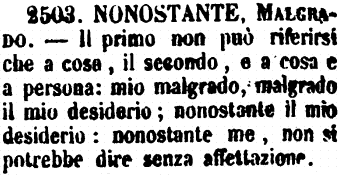 Nonostante, Malgrado - Il primo non può riferirsi che a cose, il secondo, e a cosa e a persona: mio malgrado, malgrado il mio desiderio; nonostante il mio desiderio: nonostanre me, non si potrebbe dire senza affettazione. [immagine]