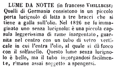 Lume da notte (in francese Vieillbuse) - Quelli di Germania consistono in un piccolo porta lucignolo di latta a tre bracci che si tiene a galla sull'olio. Nel 1826 ne fu immaginato uno senza lucignolo: è una piccola capsula leggerissima di rame inargentato, guarnita nel centro con un tubo di vetro verticale in cui l'entra l'olio, al quale si dà fuoco con il solfanello. Questo lume senza lucignolo è bello, ma il tubo ingorgandosi facilmente, rimane assai soggetto a spengersi. [immagine]