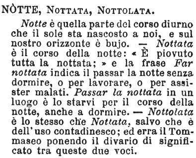 Notte, Nottata, Nottolata - Notte è quella parte del corso diurno che il sole sta nascosto a noi, e sul nostro orizzonte è bujo. - Nottata è il corso della notte: «E' piovuto tutta la nottata;» e la frase Far nottata indica il passar la notte senza dormire, o per lavorare, o per assister malati. Passar la nottata in un luogo è lo starvi per il corso della notte, anche a dormire. - Nottolata è lo stesso che Nottata, salvo che è dell'uso contadinesco; ed erra il Tommaseo ponendo il divario di significato tra queste due voci. [immagine]