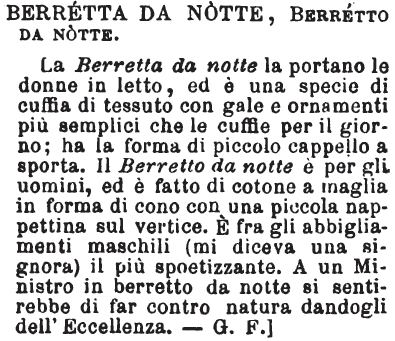 Berretta da notte, Berretto da notte - La Berretta da notte la portano le donne in letto, ed è una specie di cuffia di tessuto con gale e ornamenti più semplici che le cuffie per il giorno; ha la forma di piccolo cappello a sporta. Il Berretto da notte è per gli uomini, ed è fatto di cotone a maglia in forma di cono con una piccola nappettina sul vertice. È fra gli abbigliamenti maschili (mi diceva una signora) il più spoetizzante. A un Ministro in berretto da notte si sentirebbe di far contro natura dandogli dell'Eccellenza. - G. F.] [immagine]