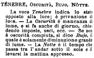 Tenebre, Oscurità, Bujo, Notte - La voce Tenebre indica lo stato opposto alla luce; è privazione di luce. - La Oscurità è mancanza di lume, e si fa anche di giorno, chiudendo imposte, usci, ecc. - Se non è oscurità compiuta, si dice Bujo, il quale è solamente diminuzione grande di lume. - La Notte è il tempo che passa tra l'andar sotto il sole e il levarsi la mattina appresso. [immagine]