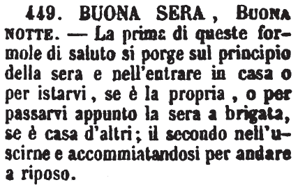 Buona sera, Buona notte - La prima di queste formole di saluto si porge sul principio della sera e nell'entrare in casa o per istarvi, se è la propria, o per passarvi appunto la sera a brigata, se è casa d'altri; il secondo nell'uscirne e accommiatandosi per andare a riposo. [immagine]