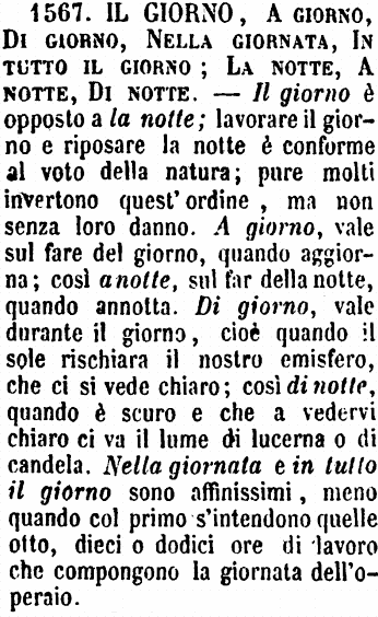 Il giorno, A giorno, Di giorno, Nella giornata, In tutto il giorno; La notte, A notte, Di notte - Il giorno è opposto a la notte; lavorare il giorno e riposare la notte è conforme al voto della natura; pure molti invertono quest'ordine, ma non senza loro danno. A giorno, vale sul fare del giorno, quando aggiorna; così a notte, sul far della notte, quando annotta. Di giorno, vale durante il giorno, cioè quando il sole rischiara il nostro emisfero, che ci si vede chiaro; così di notte, quando è scuro e che a vedervi chiaro ci va il lume di lucerna o di candela. Nella giornata e in tutto il giorno sono affinissimi, meno quando col primo s'intendono quelle otto, dieci o dodici ore di lavoro che compongono la giornata dell'operaio. [immagine]