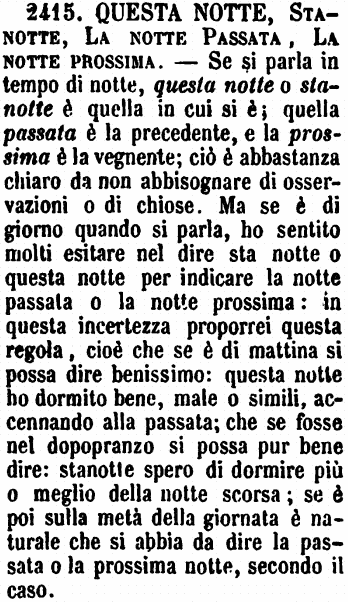 Questa notte, Stanotte, La notte passata, La notte prossima - Se si parla in tempo di notte, questa notte o stanotte è quella in cui si è; quella passata è la precedente, e la prossima è la vegnente; ciò è abbastanza chiaro da non abbisognare di osservazioni o di chiose. Ma se è di giorno quando si parla, ho sentito molti esitare nel dire sta notte o questa notte per indicare la notte passata o la notte prossima: in questa incertezza proporrei questa regola, cioè che se è di mattina si possa dire benissimo: questa notte ho dormito bene, male o simili, accennando alla passata; che se fosse nel dopopranzo si possa pur bene dire: stanotte spero di dormire più o meglio della notte scorsa; se è poi sulla metà della giornata è naturale che si abbia da dire la passata o la prossima notte, secondo il caso. [immagine]