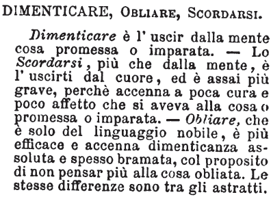 | Dimenticare, Scordare, Obliare, Sdimenticare - Dimenticare è difetto di memoria; scordare lo è di attenzione e di affezione alla cosa. Obliare è lasciare o mettere in oblìo cosa o persona a cui non si voglia più pensare. Chi ha molte cose da fare è facile ne dimentichi qualcheduna: l'ingrato si scorda i benefizii; l'uomo dabbene e generoso oblìa o procura di obliare le offese ricevute. Sdimenticare, quando volesse usarsene, direbbe dimenticare affatto: si direbbe di cosa o di persona di cui si fosse perduta totalmente la memoria. [immagine] |