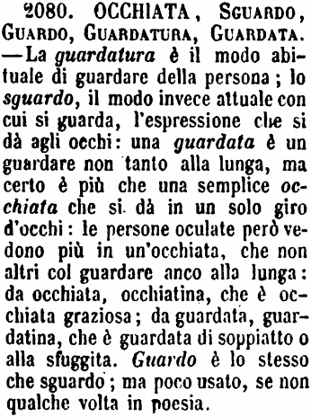 | Occhiata, Guardata, Occhiataccia - Occhiata è sguardo furtivo gettato a disegno. - «Gli dava certe occhiate, che svelavano l'animo suo.» - Quando invece l'occhiata è significativa di odio, disprezzo, o simili, allora è occhiataccia. - La Guardata è l'atto della vista che si ferma sopra un oggetto tanto tempo quanto basta a conoscerne la qualità. [immagine] |