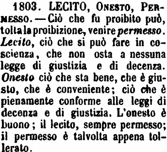 | Lecito, Onesto, Permesso - Ciò che fu proibito può, tolta la proibizione, venire permesso. Lecito, ciò che si può fare in coscienza, che non osta a nessuna legge di giustizia e di decenza. Onesto ciò che sta bene, che è giusto, che è conveniente; ciò che è pienamente conforme alle leggi di decenza e di giustizia. L'onesto è buono; il lecito, sempre permesso; il permesso è talvolta appena tollerato. [immagine] |