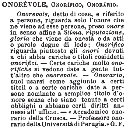 | Onorevole, Onorifico, Onorario - Onorevole, detto di cose, e riferito a persone, riguarda solo l'onore che ne viene ad esse persone, preso onore in senso affine a Stima, riputazione, gloria che viene da onestà e da atti o parole degne di lode; Onorifico riguarda piuttosto gli onori dovuti a chi abbia cariche o titoli cosiddetti onorifici. - Certe cariche molto onorifiche si vedono date a gente tutt'altro che onorevole. - Onorario, suol usarsi come aggiunto a certi titoli o a certe cariche date a persone nominate a semplice titolo d'onore senza che siano tenute a certi obblighi o abbiano certi diritti annessi all'ufficio. - «Accademico onorario della Crusca. - Professore onorario della Università di Perugia.» G.F. [immagine] |