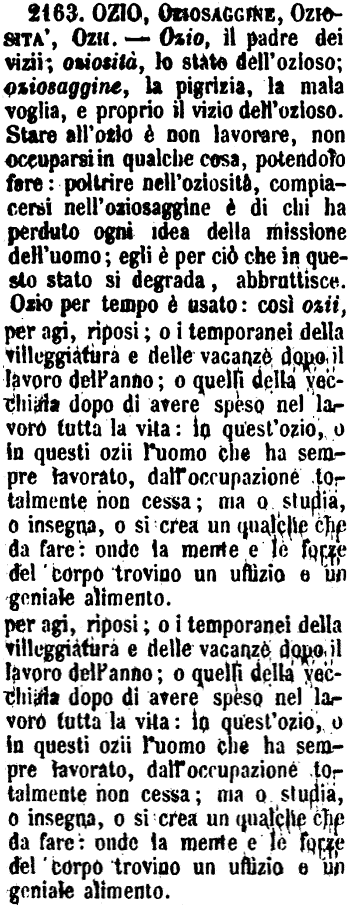 | Ozio, Oziosaggine, Oziosità, Ozii - Ozio, il padre dei vizii; oziosità, lo stato dell'ozioso; oziosaggine, la pigrizia, la mala voglia, e proprio il vizio dell'ozioso. Stare all'ozio è non lavorare, non occuparsi in qualche cosa, potendolo fare: poltrire nell'oziosità, compiacersi nell'oziosaggine è di chi ha perduto ogni idea della missione dell'uomo; egli è per ciò che in questo stato si degrada, abbruttisce. Ozio per tempo è usato: così ozii, per agi, riposi; o i temporanei della villeggiatura e delle vacanze dopo il lavoro dell'anno; o quelli della vecchiaia dopo di avere speso nel lavoro tutta la vita: in quest'ozio, o in questi ozii l'uomo che ha sempre lavorato, dall'occupazione totalmente non cessa; ma o studia, o insegna, o si crea un qualche che da fare: onde la mente e le forze del corpo trovino un uffizio e un geniale alimento. [immagine] |