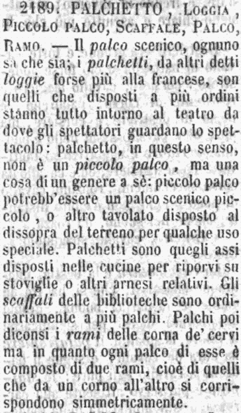 | Palchetto, Loggia, Piccolo palco, Scaffale, Palco, Ramo - Il palco scenico, ognuno sa che sia; i palchetti, da altri detti loggie forse più alla francese, son quelli che disposti a più ordini stanno tutto intorno al teatro da dove gli spettatori guardano lo spettacolo: palchetto, in questo senso, non è un piccolo palco, ma una cosa di un genere a sè: piccolo palco potrebb'essere un palco scenico piccolo, o altro tavolato disposto al dissopra del terreno per qualche uso speciale. Palchetti sono quegli assi disposti nelle cucine per riporvi su stoviglie o altri arnesi relativi. Gli scaffali delle biblioteche sono ordinariamente a più palchi. Palchi poi diconsi i rami delle corna de' cervi ma in quanto ogni palco di esse è composto di due rami, cioè di quelli che da un corno all'altro si corrispondono simmetricamente. [immagine] |