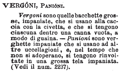 | Vergoni, Panioni - Vergoni sono quelle bacchette grosse, impaniate, che si usano alla caccia con la civetta, e che si tengono ciascuna dentro una canna vuota, a modo di guaina. - Panioni sono verghette impaniate che si usano ad altre uccellagioni, e, nel tempo che non si adoperano, si tengono rinvoltate in una grossa tela impaniata. (Vedi il num. 2237). [immagine] |