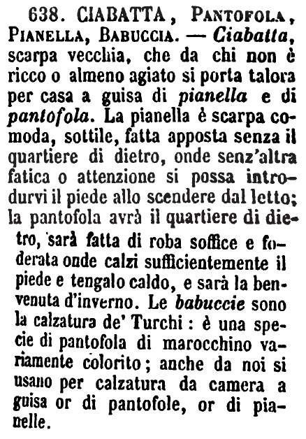 | Babbuccia, Pantofola, Pianella, Ciabatta, Zoccolo - Babbuccia è una qualità di pianella appuntata, che è usata specialmente dagli Orientali, e che usasi anche fra noi, ma per casa. - La Pantofola è una scarpa assai comoda, con tomajo generalmente di pannolano e foderata di pelo, che si usa per casa l'inverno, affine di tener caldi i piedi. - Pianella è scarpa da casa, spesso senza il quartiere di dietro, e con piccolo tacco, come la Babbuccia; ora quasi fuor d'uso. - Ciabatta è scarpa vecchia, o tagliatole o buttato giù il quartiere di dietro, che suol portarsi per casa dalle donne di bassa condizione. - Lo Zoccolo è una specie di scarpa molto scollata con tomajo di vacchetta, senza quartiere di dietro, con pianta e tacco di legno piuttosto alto. Lo usano coloro che per loro mestiere stanno molto sopra terreno umido, e specialmente le trecche di mercato. [immagine] |