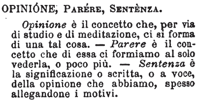 | Opinione, Parere, Sentenza - Opinione è il concetto che, per via di studio e di meditazione, ci si forma di una tal cosa. - Parere è il concetto che di essa ci formiamo al solo vederla, o poco più. - Sentenza. è la significazione o scritta, o a voce, della opinione che abbiamo, spesso allegandone i motivi. [immagine] |