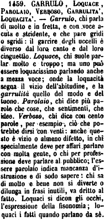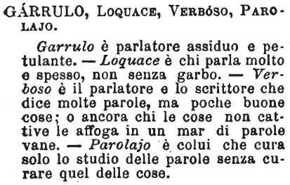 | Garrulo, Loquace, Verboso, Parolajo - Garrulo è parlatore assiduo e petulante. - Loquace è chi parla molto e spesso, non senza garbo. - Verboso è il parlatore e lo scrittore che dice molte parole, ma poche buone cose; o ancora chi le cose non cattive le affoga in un mar di parole vane. - Parolajo è colui che cura solo lo studio delle parole senza curare quel delle cose. [immagine] |
