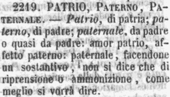 | Patrio, Paterno, Paternale - Patrio, di patria; paterno, di padre; paternale, da padre o quasi da padre: amor patrio, affetto paterno: paternale, facendone un sostantivo, non si dice che di riprensione o ammonizione, come meglio si vorrà dire. [immagine] |