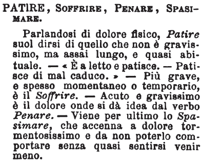 | Patire, Soffrire, Penare, Spasimare - Parlandosi di dolore fisico, Patire suol dirsi di quello che non è gravissimo, ma assai lungo, e quasi abituale. - «E' a letto e patisce. - Patisce di mal caduto.» - Più grave, e spesso momentaneo o temporario, è il Soffrire. - Acuto e gravissimo è il dolore onde si dà idea dal verbo Penare. - Viene per ultimo lo Spasimare, che accenna a dolore tormentosissimo e da non poterlo comportare senza quasi sentirsi venir meno. [immagine] |