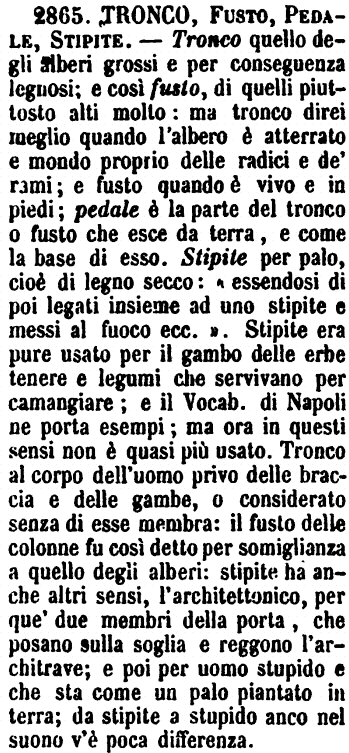 | Tronco, Fusto, Pedale, Stipite - Tronco quello degli alberi grossi e per conseguenza legnosi; e così fusto, di quelli piuttosto alti molto: ma tronco direi meglio quando l'albero è atterrato e mondo proprio delle radici e de' rami; e fusto quando è vivo e in piedi; pedale è la parte del tronco o fusto che esce da terra, e come la base di esso. Stipite per palo, cioè di legno secco: « essendosi di poi legati insieme ad uno stipite e messi al fuoco ecc. ». Stipite era pure usato per il gambo delle erbe tenere e legumi che servivano per camangiare; e il Vocab. di Napoli ne porta esempi; ma ora in questi sensi non è quasi più usato. Tronco al corpo dell'uomo privo delle braccia e delle gambe, o considerato senza di esse membra: il fusto delle colonne fu così detto per somiglianza a quello degli alberi: stipite ha anche altri sensi, l'architettonico, per que' due membri della porta, che posano sulla soglia e reggono l'architrave; e poi per uomo stupido e che sta come un palo piantato in terra; da stipite a stupido anco nel suono v'è poca differenza. [immagine] |