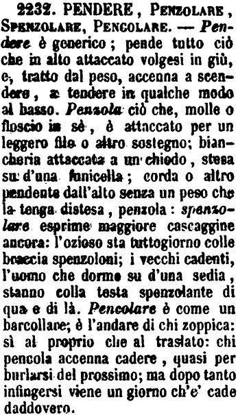 | Pendere, Penzolare, Spenzolare, Pencolare - Pendere è generico; pende tutto ciò che in alto attaccato volgesi in giù, e, tratto dal peso, accenna a scendere, a tendere in qualche modo al basso. Penzola ciò che, molle o floscio in sè, è attaccato per un leggero filo o altro sostegno; biancheria attaccata a un chiodo, stesa su d'una funicella; corda o altro pendente dall'alto senza un peso che la tenga distesa, penzola: spenzolare esprime maggiore cascaggine ancora: l'ozioso sta tuttogiorno colle braccia spenzoloni; i vecchi cadenti, l'uomo che dorme su d'una sedia, stanno colla testa spenzolante di qua e di là. Pencolare è come un barcollare; è l'andare di chi zoppica: sì al proprio che al traslato: chi pencola accenna cadere, quasi per burlarsi del prossimo; ma dopo tanto infingersi viene un giorno ch'e' cade daddovero. [immagine] |