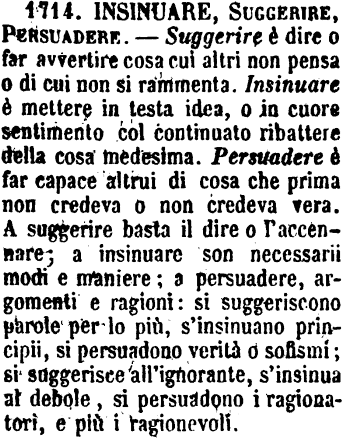 | Insinuare, Suggerire, Persuadere - Suggerire è dire o far avvertire cosa cui altri non pensa o di cui non si rammenta. Insinuare è mettere in testa idea, o in cuore sentimento col continuato ribattere della cosa medesima. Persuadere è far capace altrui di cosa che prima non credeva o non credeva vera. A suggerire basta il dire o l'accennare; a insinuare son necessarii modi e maniere; a persuadere, argomenti e ragioni: si suggeriscono parole per lo più, s'insinuano principii, si persuadono verità o sofismi; si suggerisce all'ignorante, s'insinua al debole, si persuadono i ragionatori, e più i ragionevoli. [immagine] |