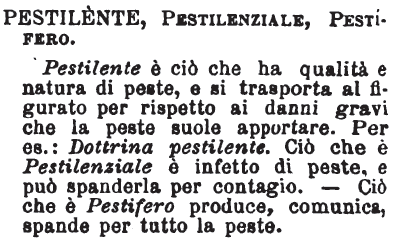 | Pestilente, Pestilenziale, Pestifero, Appestato - Pestilente chi o che ha la peste latente o palese; pestilenziale, che sa di peste, che l'esala; pestifero, che la porta e che la può comunicare; appestato, l'uomo malato della peste. Pestifero ha senso traslato: uomo pestifero; chi semina la zizzania e massime pestifere, cioè cattivissime, pessime, corrompitrici. [immagine] |