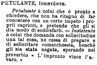 | Petulante, Insistente - Petulante è colui che è pronto a chiedere, che non ha ritegno di far conoscere con un certo impeto i proprii capricci, e pretende che gli si dia modo di soddisfarli. - Insistente è colui che domanda con sollecitudine una tal cosa, nè cessa di pregare e di sollecitare comecchessia, benchè gli sia stata negata, sperando nel proverbio «L'impronto vince l'avaro.» [immagine] |