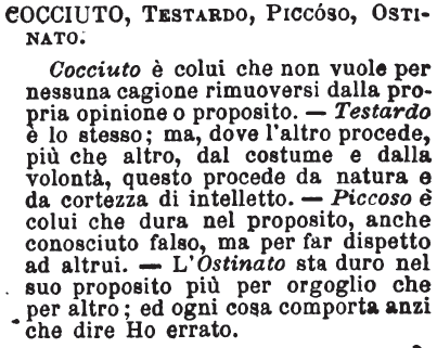 | Cocciuto, Testardo, Piccoso, Ostinato - Cocciuto è colui che non vuole per nessuna cagione rimuoversi dalla propria opinione o proposito. - Testardo è lo stesso; ma, dove l'altro procede, più che altro, dal costume e dalla volontà, questo procede da natura e da cortezza di intelletto. - Piccoso è colui che dura nel proposito, anche conosciuto falso, ma per far dispetto ad altrui. - L'Ostinato sta duro nel suo proposito più per orgoglio che per altro; ed ogni cosa comporta anzi che dire Ho errato. [immagine] |
