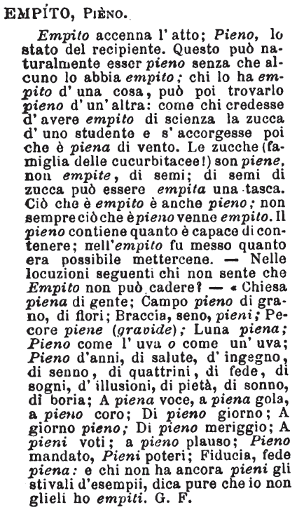 | Empito, Pieno - Empito accenna l'atto; Pieno, lo stato del recipiente. Questo può naturalmente esser pieno senza che alcuno lo abbia empito; chi lo ha empito d'una cosa, può poi trovarlo pieno d'un'altra: come chi credesse d'avere empito di scienza la zucca d'uno studente e s'accorgesse poi che è piena di vento. Le zucche (famiglia delle cucurbitacee!) son piene, non empite, di semi; di semi di zucca può essere empita una tasca. Ciò che è empito è anche pieno; non sempre ciò che è pieno venne empito. Il pieno contiene quanto è capace di contenere; nell'empito fu messo quanto era possibile mettercene. - Nelle locuzioni seguenti chi non sente che Empito non può cadere? - «Chiesa piena di gente; Campo pieno di grano, di fiori; Braccia, seno, pieni; Pecore piene (gravide); Luna piena; Pieno come l'uva o come un'uva; Pieno d'anni, di salute, d'ingegno, di senno, di quattrini, di fede, di sogni, d'illusioni, di pietà, di sonno, di boria; A piena voce, a piena gola, a pieno coro; Di pieno giorno; A giorno pieno; Di pieno meriggio; A pieni voti; a pieno plauso; Pieno mandato, Pieni poteri; Fiducia, fede piena: e chi non ha ancora pieni gli stivali d'esempii, dica pure che io non glieli ho empiti. G.F. [immagine] |