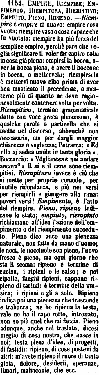 | Empire, Riempire; Empimento, Riempitura, Riempitivo; Empiuto, Pieno, Ripieno - Riempire è empire di nuovo: empire cosa vuota; riempire vaso o cosa capace che fu vuotata: riempire ha più forza dl semplice empire, perchè pare che voglia significare il voler far capire roba in cosa già piena: empirsi la bocca, aver la bocca piena, è avere il boccone in bocca, o mettervelo; riempirsela è mettervi nuovo cibo prima di aver ben masticato il precedente, o metterne più di quanto ne deve ragionelvolmente contenere volta per volta. Riempitivo, termine grammaticale detto con voce greca pleonasmo, è qualche parola o particella che si mette nel discorso, abbenchè non necessaria, ma per dargli maggior chiarezza o vaghezza; Petrarca: «Ed ella si sedea umile in tanta gloria». Boccaccio: «Vogliancene noi andare ancora?» Il si e il cene sono riempitivi. Riempitura invece è ciò che si mette per proprio comodo, per inutile ridondanza, e più nei versi per riempirli e giungere alla rima: poveri versi! Empimento, è l'atto del riempire. Pieno, ripieno indicano lo stato; empiuto, riempiuto richiamano all'idea l'azione dell'empimento o del riempimento succeduto. Pieno dice anco una pienezza naturale, non fatta da mano d'uomo; le noci, le noccìuole son piene, l'uovo fresco è pieno, ma ogni giorno che sta lì scema: ripieno è termine di cucina, i ripieni e le salse; e poi cipolle, funghi ripieni, cappone ripieno di tartufi: è termine della musica; i ripieni e gli a solo. Ripieno indica poi una pienezza che trascende e trabocca; ne ho ripiena la testa, vale ne ho il capo rotto, intronato, non so più quel che mi faccia. Pieno adunque, anche nel traslato, dicesi meglio di cosa nostra, che nasce in noi; testa piena d'idee, di progetti, di fastidii: ripieno, di cose postevi da altri: m'avete ripieno il cuore di tanta gioia, dolore, desiderii, speranze, timori, malinconie, che ecc. [immagine] |