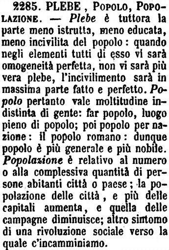 | Plebe, Popolo, Popolazione - Plebe è tuttora la parte meno istrutta, meno educata, meno incivilita del popolo: quando negli elementi tutti di esso vi sarà omogeneità perfetta, non vi sarà più vera plebe, l'incivilimento sarà in massima parte fatto e perfetto. Popolo pertanto vale moltitudine indistinta di gente: far popolo, luogo pieno di popolo; poi popolo per nazione: il popolo romano: dunque popolo è più generale e più nobile. Popolazione è relativo al numero o alla complessiva quantità di persone abitanti città o paese; la popolazione delle città, e più delle capitali aumenta, e quella delle campagne diminuisce; altro sintomo di una rivoluzione sociale verso la quale c'incamminiamo. [immagine] |