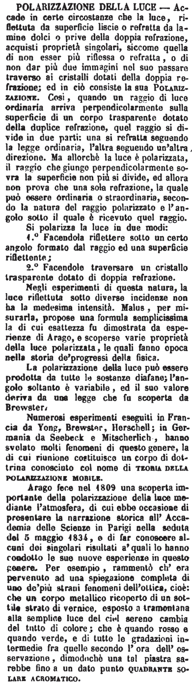 Arago fece nel 1809 una scoperta importante della polarizzazione della luce mediante l'atmosfera, di cui ebbe occasione di presentare la narrazione storica all'Accademia delle Scienze in Parigi nella seduta del 5 maggio 1834, e di far conoscere alcuni dei singolari risultati a' quali lo hanno condotto le sue nuove esperienze in questo genere. Per esempio, rammentò ch'era pervenuto ad una spiegazione completa di uno de' più strani fenomeni dell'ottica, cioè: che un corpo metallico ricoperto di un sottile strato di vernice, esposto a tramontana alla semplice luce del ciel sereno cambia del tutto di colore; che è quando rosso e quando verde, e di tutte le gradazioni intermedie fra quelle secondo l'ora dell'osservazione, dimodochè una tal piastra sarebbe fino a un dato punto quadrante solare acromatico. [immagine]