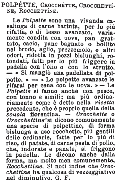 | Polpette, Crocchette, Crocchettine, Rocchettine - Le Polpette sono una vivanda casalinga di carne battuta, per lo più rifatta, o di lesso avanzato, variamente condita con uova, pan grattato, cacio, pane bagnato o bollito nel brodo, aglio, prezzemolo, e altri odori, ridotta in pezzi bislunghi, rotondati, fatti per lo più friggere in padella con l'olio o con lo strutto. - « Si mangiò una padellata di polpette. » - « Le polpette avanzate le rifarai per cena con le uova. » - Le Polpette si fanno anche con pesce, con tonno e simili; ma più ordinariamente come è detto nella ricetta precedente, che è proprio quella della scuola fiorentina. - Crocchette o Crocchettine si dicono comunemente una specie di polpettine, di forma bislunga a uso rocchetto, più gentili delle ordinarie, fatte per lo più di riso, di patate, di carne pesta di pollo, che, indorate e panate, si friggono in padella. Le dicono anche dalla forma, ma molto men comunemente, Rocchettine. Si noti infine che Crocchettine ha qualcosa di vezzeggiativo nel diminutivo. G. F. [immagine] |