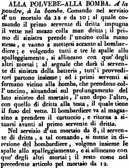 Alla polvere - Alla bomba - A la poudre, à la bombe. Comando nel servizio d'un mortaio da 12 e da 10; al quale comando il primo servente di dritta impugna il vette nel mezzo colla man dritta; il primo di sinistra prende l'uncino colla mano stessa, e vanno a mettersi accanto al bombardiere; e volgendo tutti e tre le spalle allo spalleggiamento, si allineano con que' degli altri mortai; al segnale che darà il servente di sinistra della batteria, tutt'i provveditori partono insieme; ed i primi serventi si fermano vicino alla bomba, che prendono coll'uncino, situandosi sul prolungamento del lato sinistro del mortaio, l'uno dopo l'altro, con quello di dritta alla testa, il quale tiene il fuso del vette. Il bombardiere va al magazzino a prendere il cartuccio, e ritorna a situarsi avanti al primo servente di dritta.