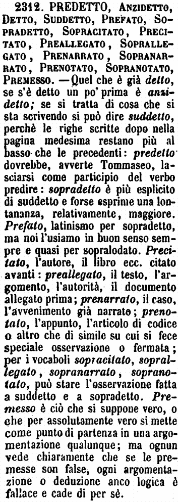 | Predetto, Anzidetto, Detto, Suddetto, Prefato, Sopradetto, Sopracitato, Precitato, Preallegato, Soprallegato, Prenarrato, Sopranarrato, Prenotato, Sopranotato, Premesso - Quel che è già detto, se s'è detto un po' prima è anzidetto; se si tratta di cosa che si sta scrivendo si può dire suddetto, perchè le righe scritte dopo nella pagina medesima restano più al basso che le precedenti: predetto dovrebbe, avverte Tommaseo, lasciarsi come participio del verbo predire: sopradetto è più esplicito di suddetto e forse esprime una lontananza, relativamente, maggiore. Prefato, latinismo per sopradetto, ma noi l'usiamo in buon senso sempre e quasi per sopralodato. Precitato, l'autore, il libro ecc. citato avanti: preallegato, il testo, l'argomento, l'autorità, il documento allegato prima; prenarrato, il caso, l'avvenimento già narrato; prenotato, l'appunto, l'articolo di codice o altro che di simile su cui si fece speciale osservazione o fermata; per i vocaboli sopracitato, soprallegato, sopranarrato, sopranotato, può stare l'osservazione fatta a suddetto e a sopradetto. Premesso è ciò che si suppone vero, o che per assolutamente vero si mette come punto di partenza in una argomentazione qualunque; ma ognun vede chiaramente che se le premesse son false, ogni argomentazione o deduzione anco logica è fallace e cade di per sè. [immagine] |